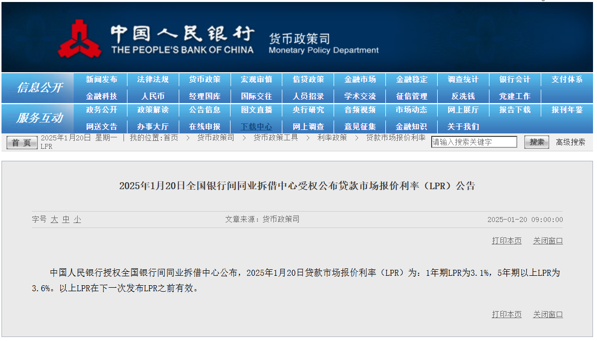 2025年1月20日全国银行间同业拆借中心受权公布贷款市场报价利率(LPR)公告